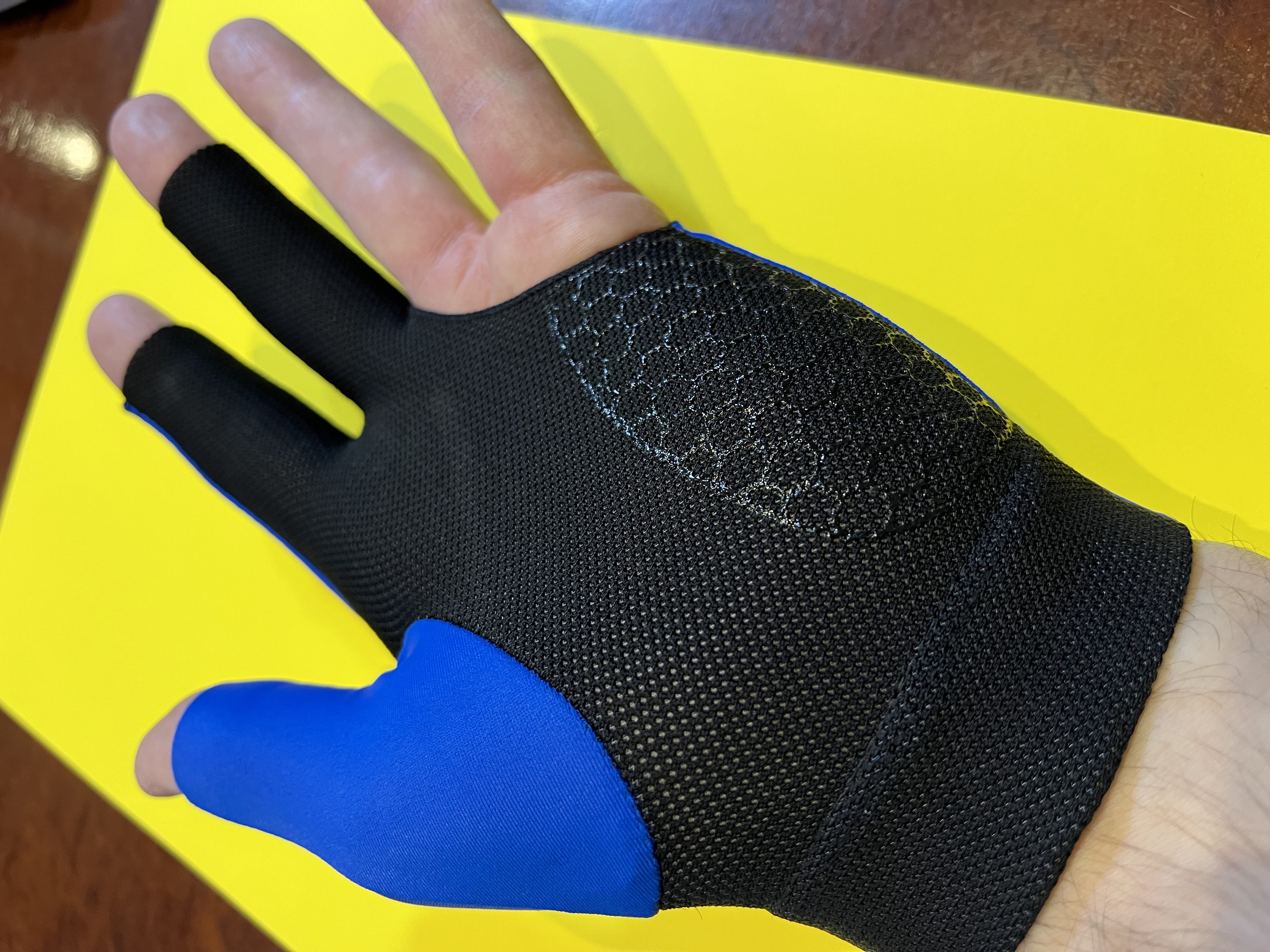 Перчатка изготовлена из комбинации нейлона и эластана, что обеспечивает её эластичность, прочность и комфорт. Материалы гарантируют мягкость и лёгкость в носке, что особенно важно при длительных матчах или тренировках. Она плотно прилегает к руке, создавая ощущение второй кожи, что позволяет игроку чувствовать кий максимально естественно.