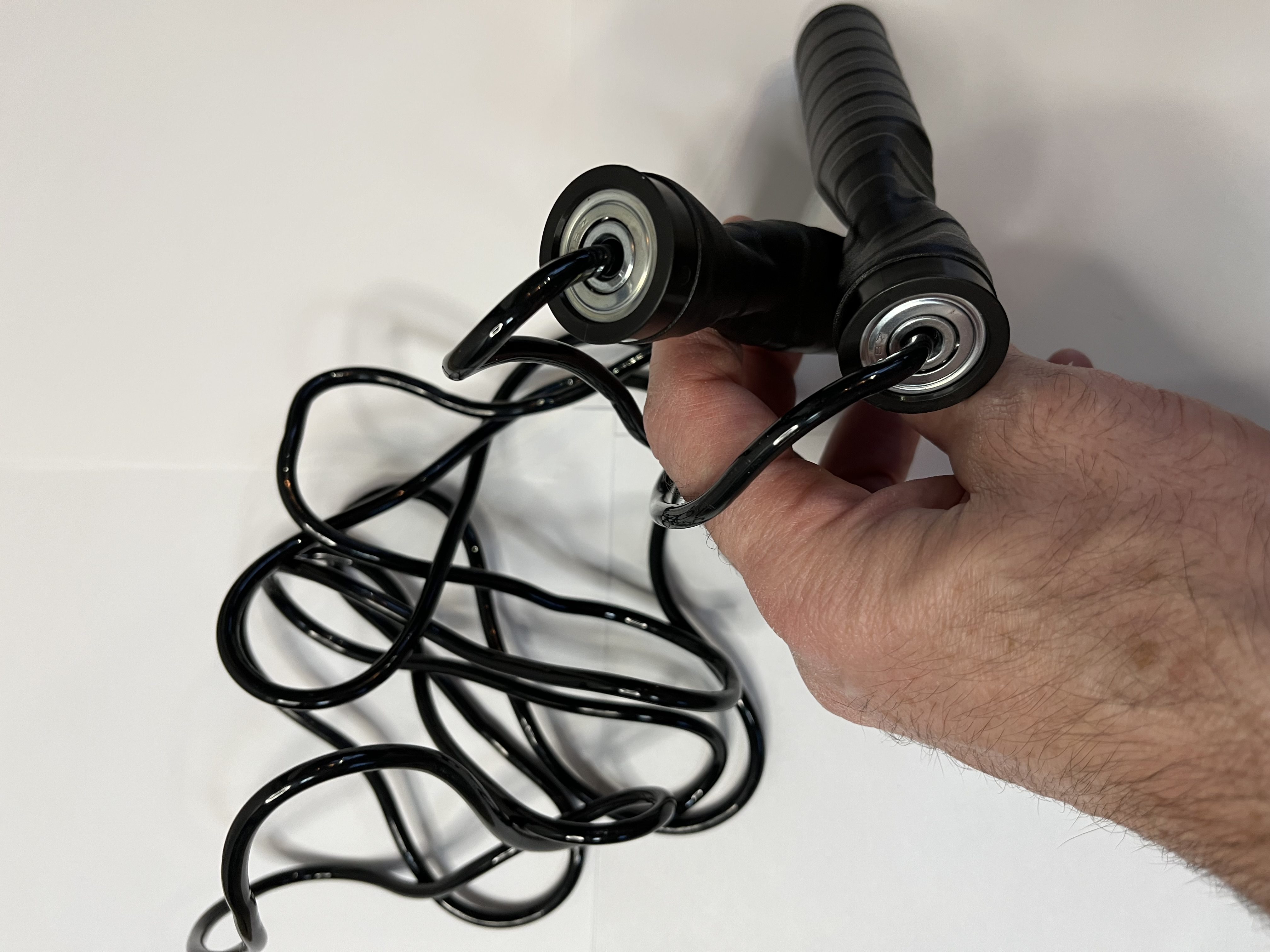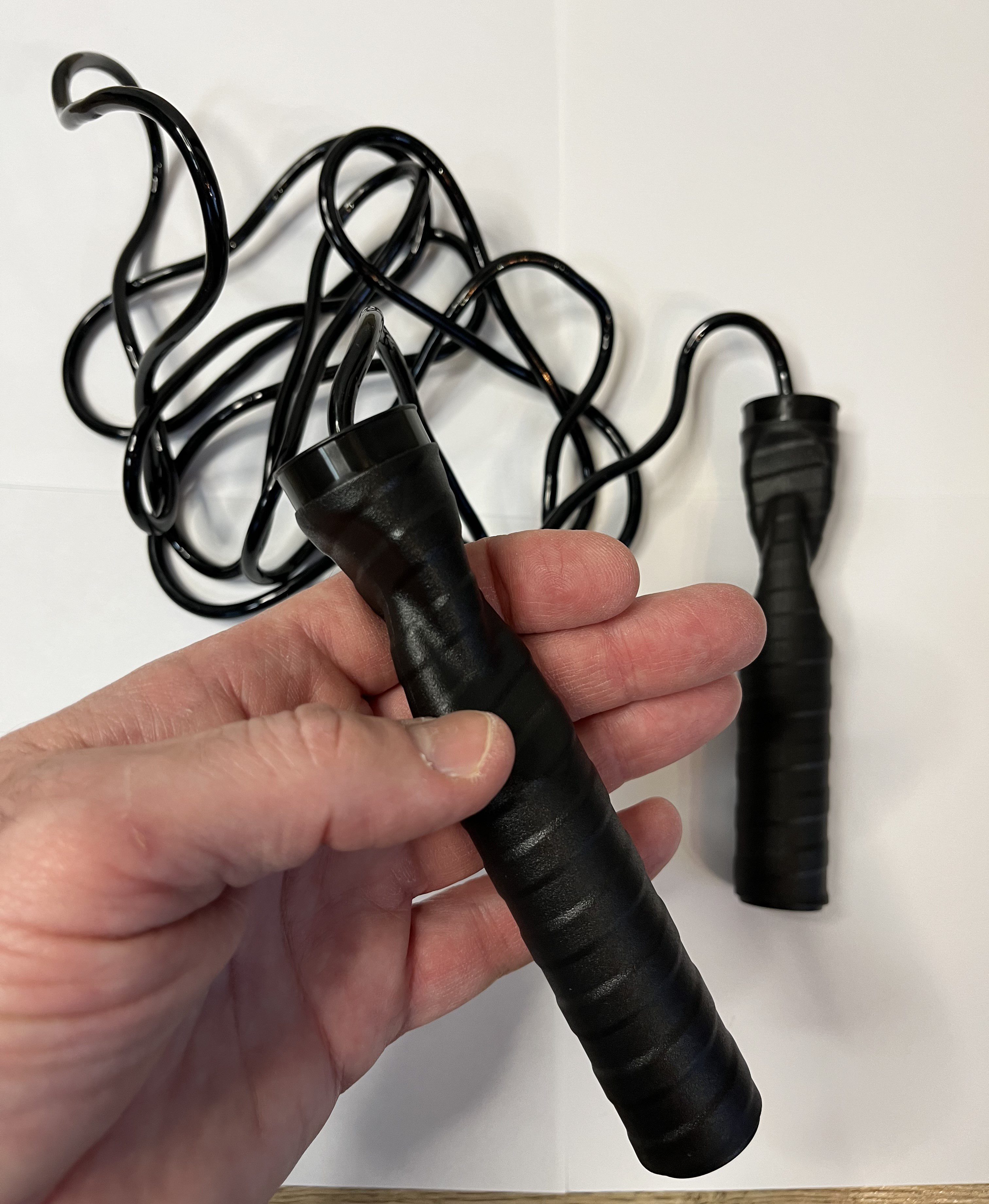 Ручки скакалки выполнены из пластика. Внутри они пустотелые. В них располагаются концы жгута. Которые можно подрезать, чтобы сделать скакалку короче. Максимальная длина жгута составляет 2,75 м.