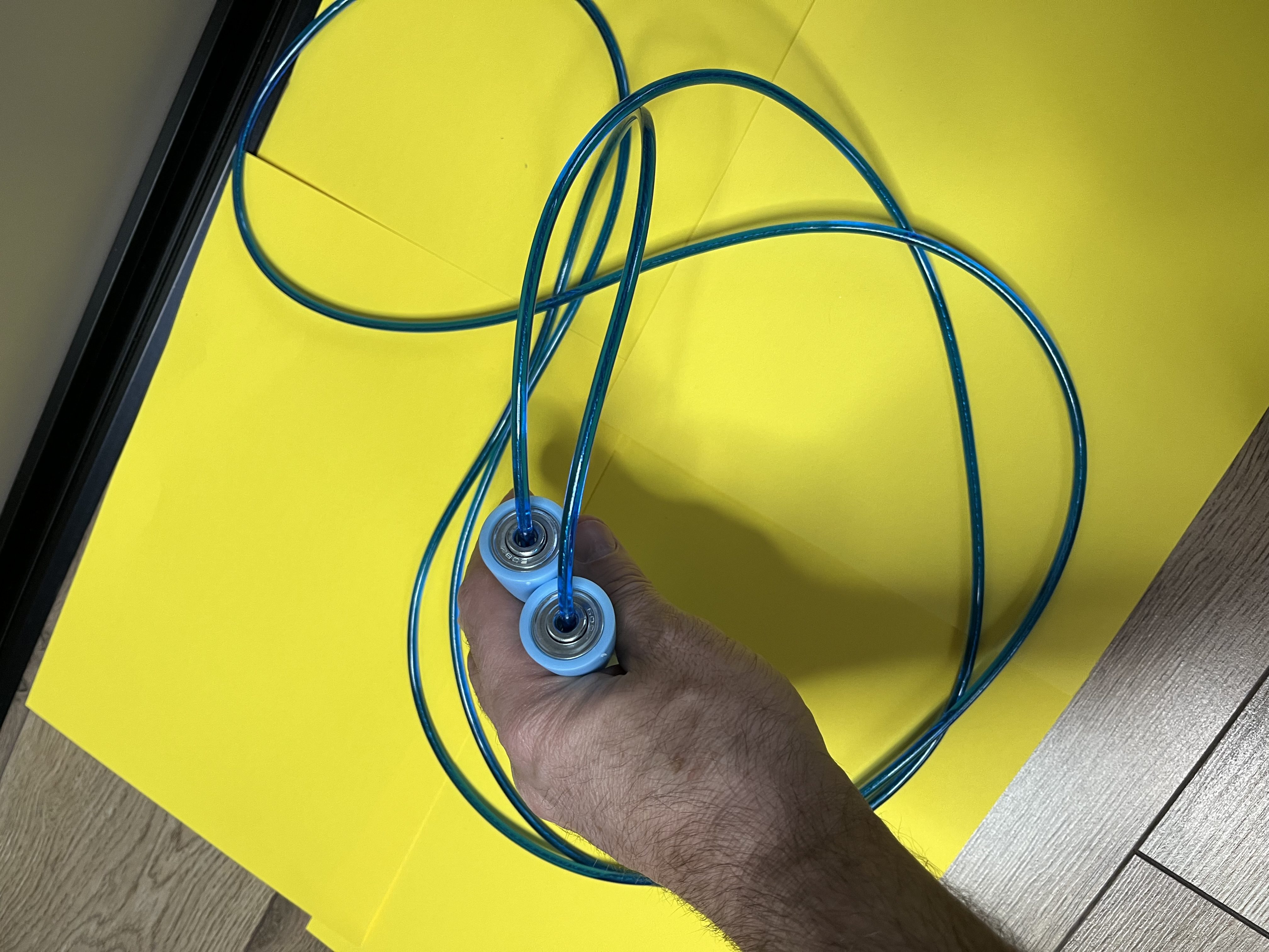 В ручках скакалки используются подшипники, которые способствуют быстрому вращению троса. Трос выполнен из металла и покрыт PVC материалом. Это помогает защитить его от коррозии и продлить срок службы скакалки. Металлическому тросу нестрашны никакие нагрузки, н прочный и долговечный. Пластиковые ручки весят мало и не перегружают кисти.