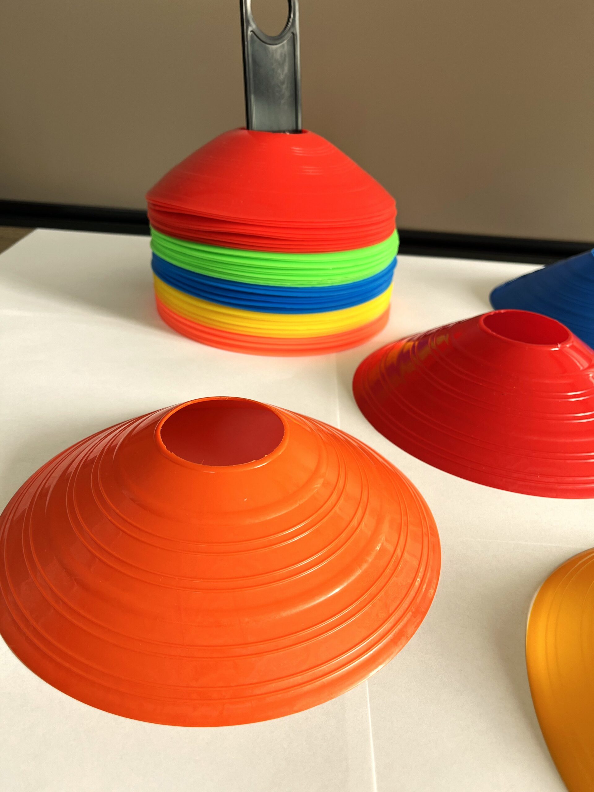 Простая конструкция позволяет быстро нанести временную разметку для тренировок или проведения спортивных мероприятий. Наличие отверстия в верхней части даёт возможность использовать фишку вместе с флажком, что значительно повышает её видимость.