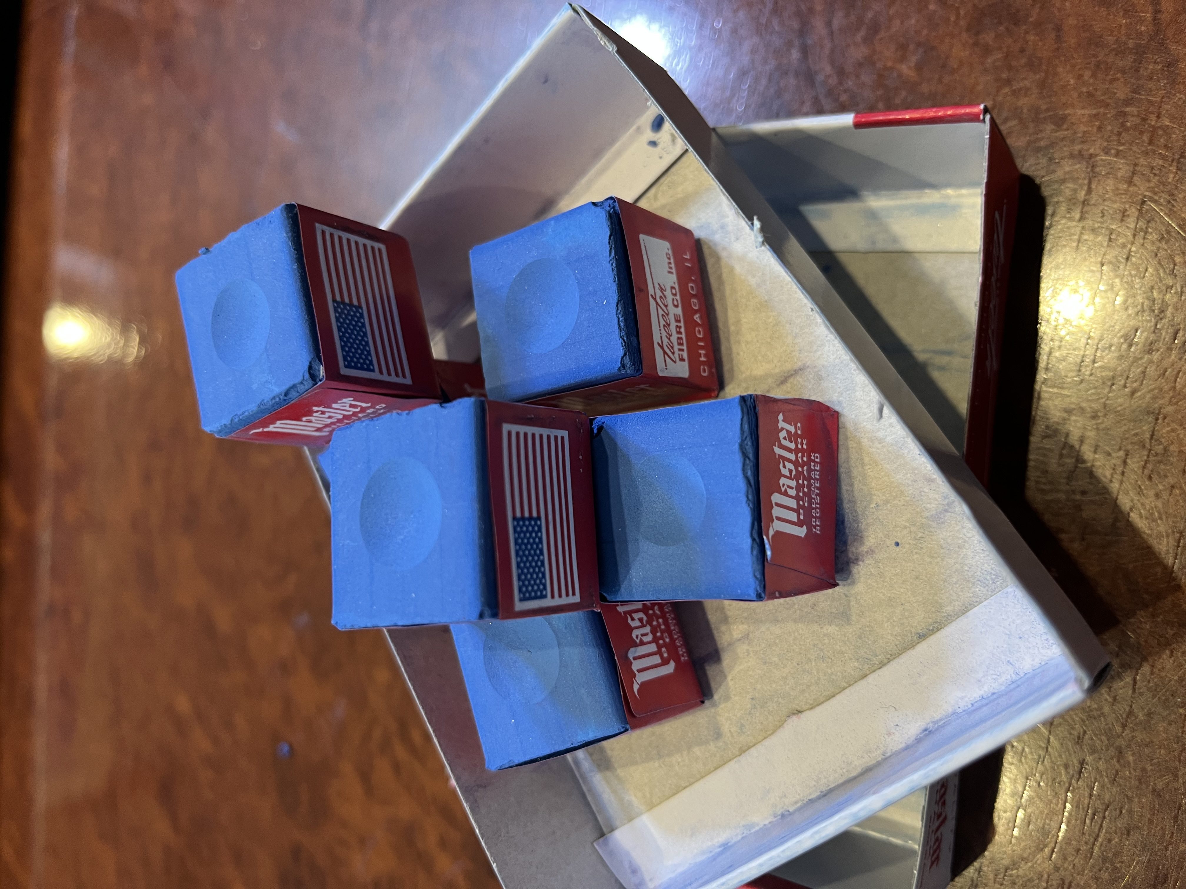 Для изготовления мела используют следующие компоненты: мел (карбонат кальция), иллинойский кварцевый песок, оксид алюминия в качестве абразива и краситель. Под прессом из молотой смеси формируют кубики ровного размера. Плотная бумажная упаковка оставляет открытой лишь одну грань кубика, на которой формируется специальная лунка. Это обеспечивает более плотный контакт с кием и удобство в использовании.